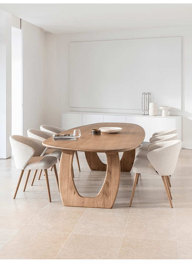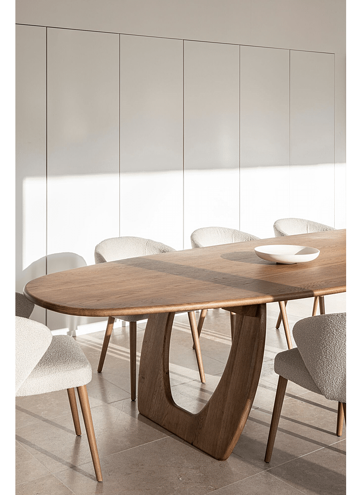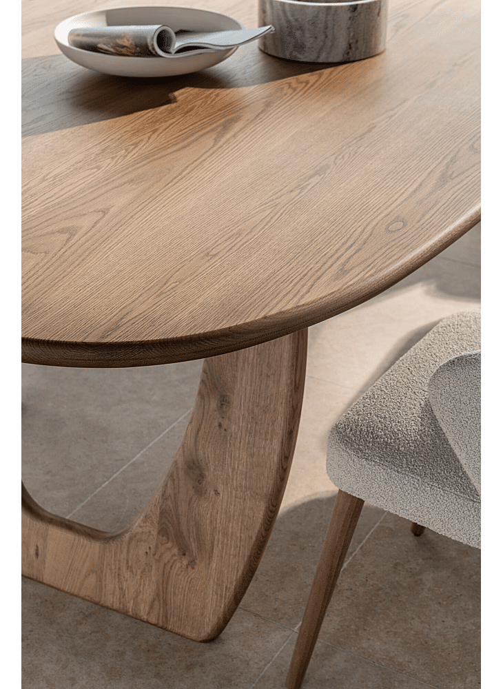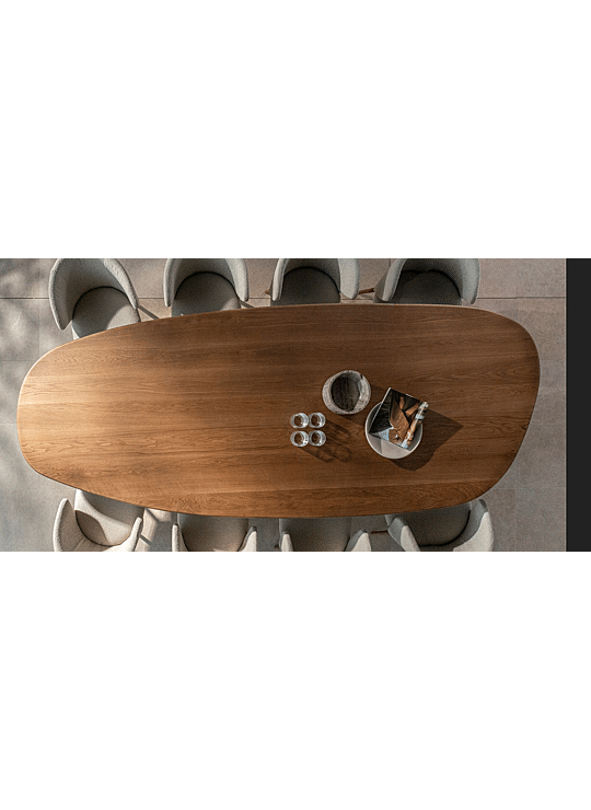 Daarmee wil de ontwerpster van deze eettafel het tropische gevoel bij je thuis brengen. Het blad en de poten zijn gemaakt uit massief eikenhout waarbij je kan kiezen uit 5 kleurafwerkingen: natural 24, tobacco 20, grey 26, anthracite 25 of black 02.