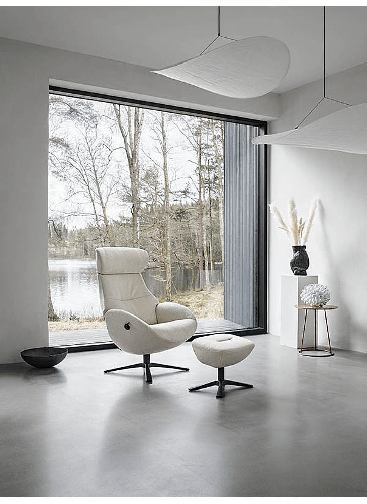 De stoel staat op een zwart metalen swivel quatro-voet en wordt inclusief bijpassend voetbankje geleverd.